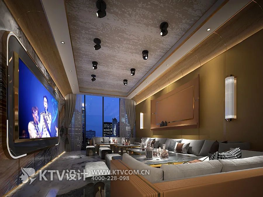 包厢整体环境以铜色系为主基调,为了避免整体呈现富丽堂皇的感觉,设计师秉承一贯的商务KTV风格加以提炼,以简约前卫的欧式基础结合现代元素,融合更多年轻人喜欢的ktv元素打造,让高端商务KTV不再是一个简单的唱歌加喝酒的空间。